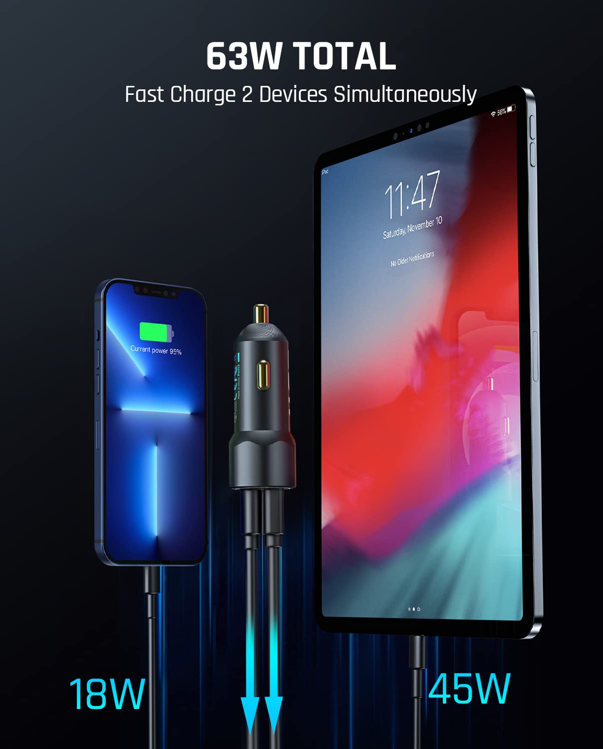 - 【Smart&Quick Charging】This 2-Port car charger can intelligently charge 2 devices simultaneously at full speed with type c PD45W & USB QC18W output, up to 9X faster charging speed than the standard charger. The USB-C port can deliver 65W MAX output when used alone.