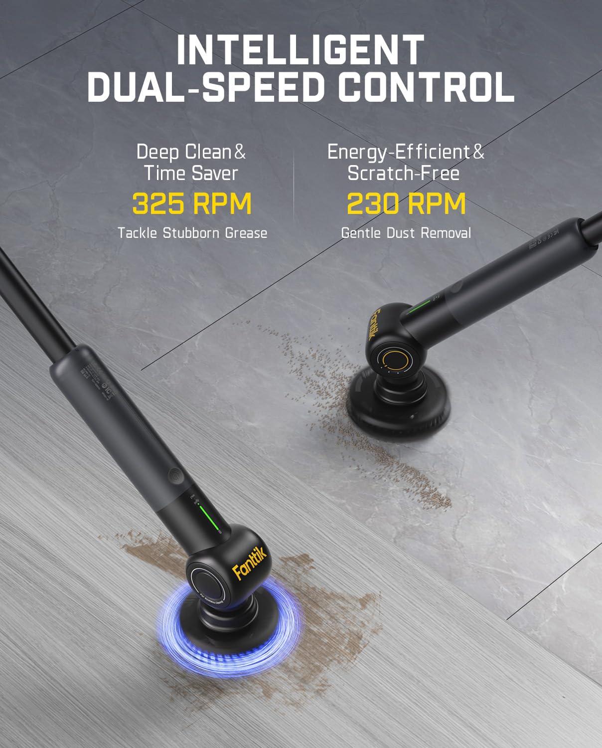 - Dual-Speed Control for Superior Cleaning: 230 RPM for daily cleaning & 325 RPM for tough jobs. High-performance VoltiPulse motor works smarter than single-speed scrubbers, saving time and effort