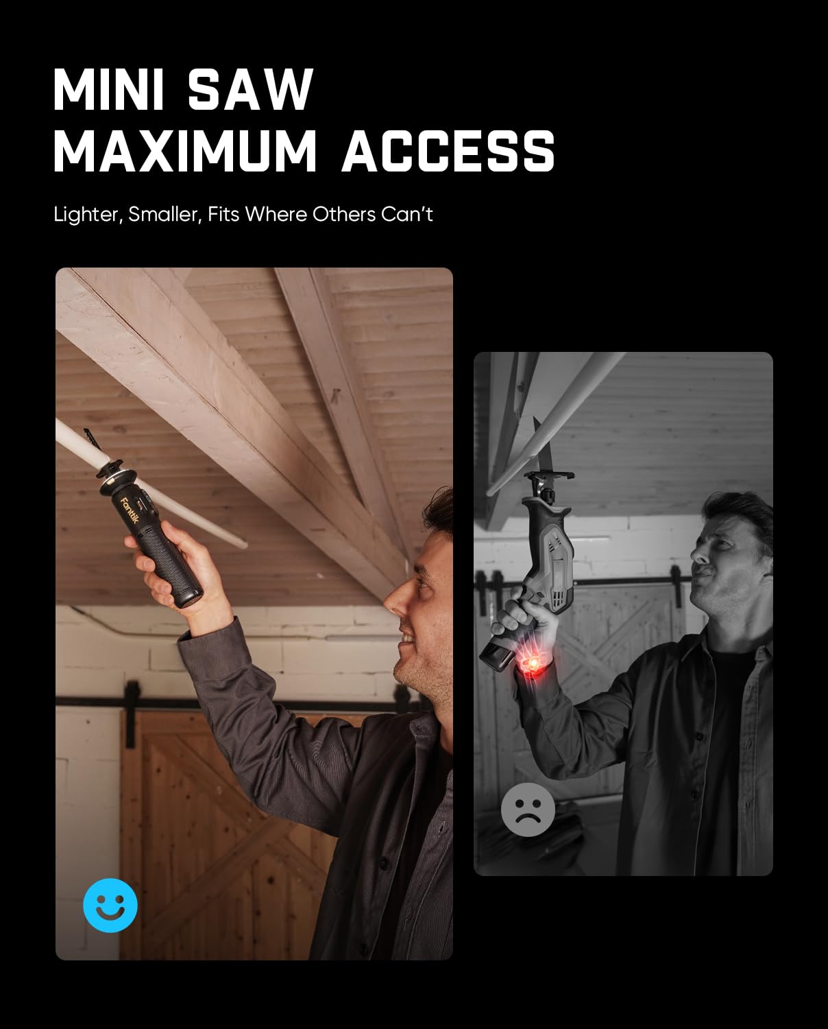- Mini & Easy to Use: The R11 Pro reciprocating saw features dual-axis coaxial drive. At 8.92*2.4 inch, it’s easy to store and portable. Dual counterweight system reduces vibration for comfort and control—enabling precise cuts with less fatigue