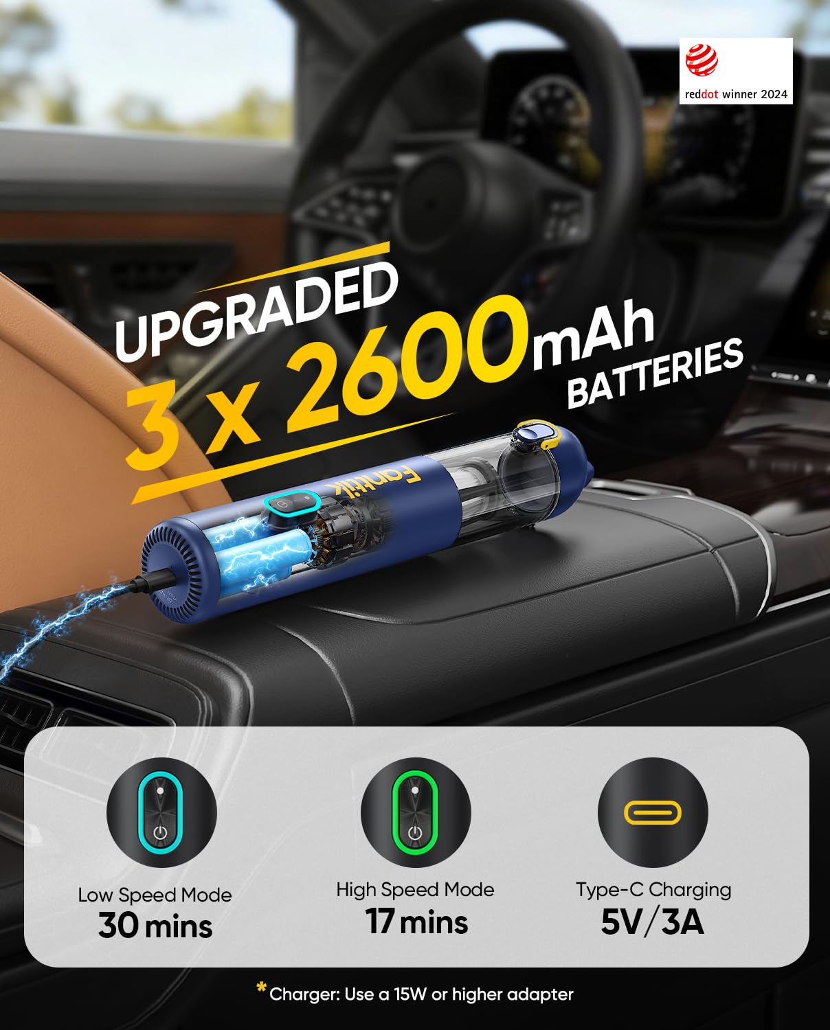 - Enhanced Runtime: Featuring a 2600mAh three-cell battery, the portable car vacuum provides 17-mins use on high mode and 30 mins on low. With a 41.2% increase in battery life from the previous model, this car vacuum tackles multiple small tasks
